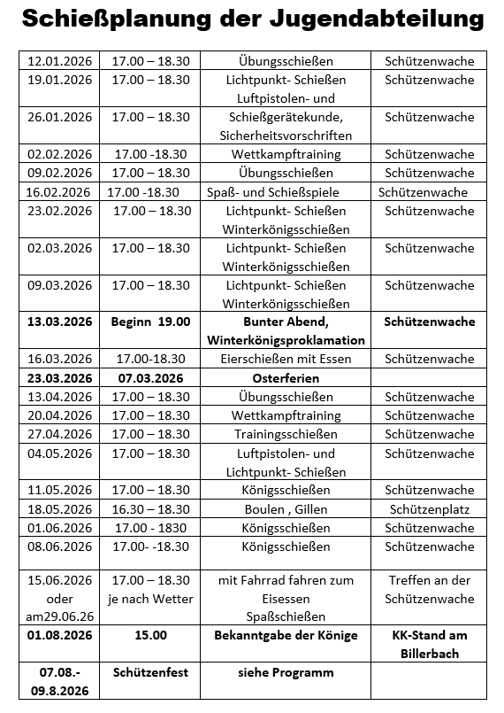 Dank unserer engagierten Jugend- und Schießsportleiter blicken wir auf ein buntes Programm zurück, das weit über das reine Training hinausgeht. Die Geselligkeit steht bei uns hoch im Kurs: Ob Sommer- und Winterkönigsschießen, das beliebte Eier- und Überraschungseier-Schießen oder spannende Schießspiele – der Spaßfaktor ist garantiert. Abseits des Schießstands stärken wir unseren Zusammenhalt durch gemeinsame Aktivitäten wie Boule, Grillabende, Fahrradtouren oder das obligatorische Eis- und Pizzaessen. Auch Gesellschaftsspiele während der Wartezeiten und eine feierliche Weihnachtsfeier gehören fest zu unserem Vereinsjahr.